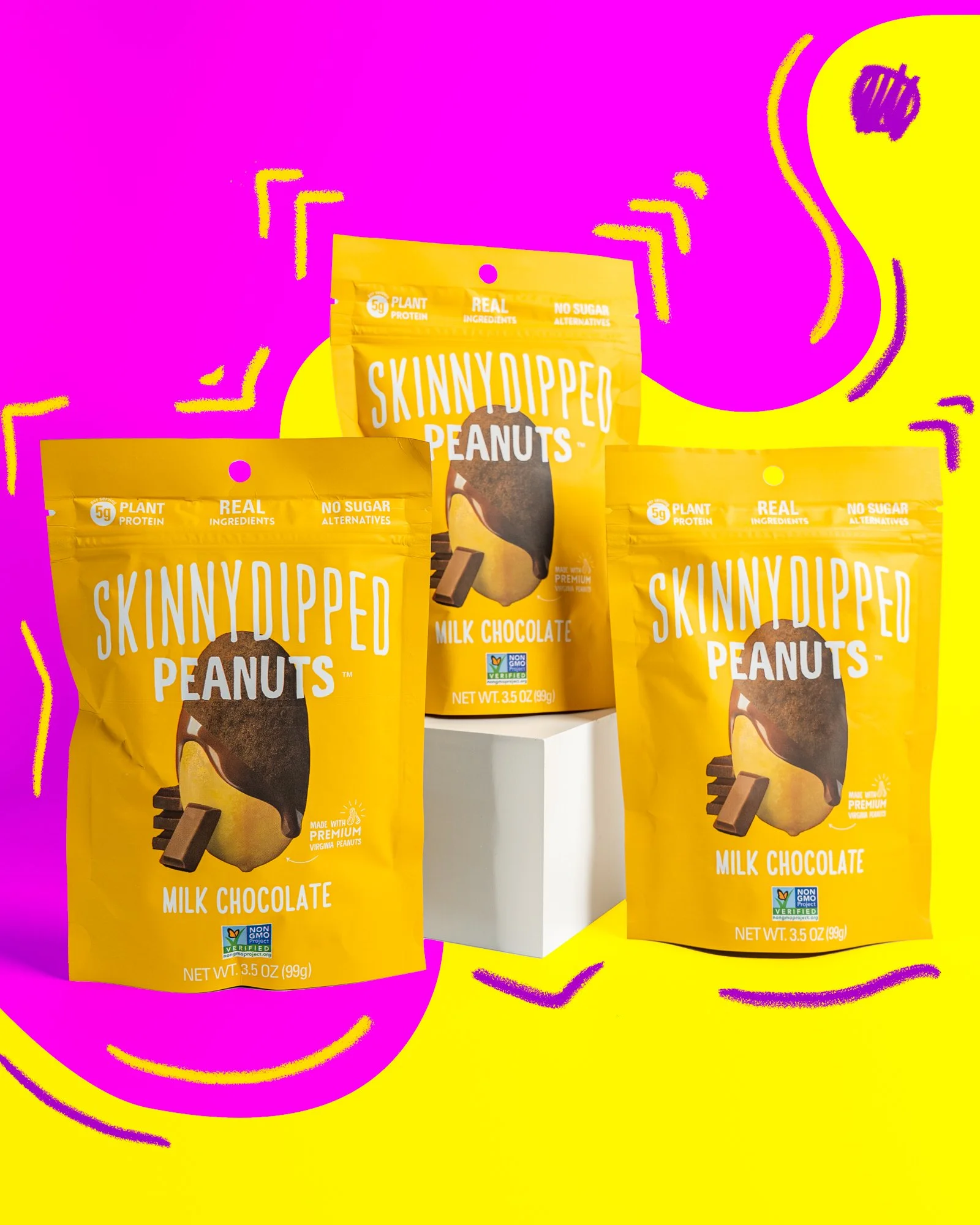 Milk Chocolate Peanuts with multiple bags arranged across levels against a multicolored background