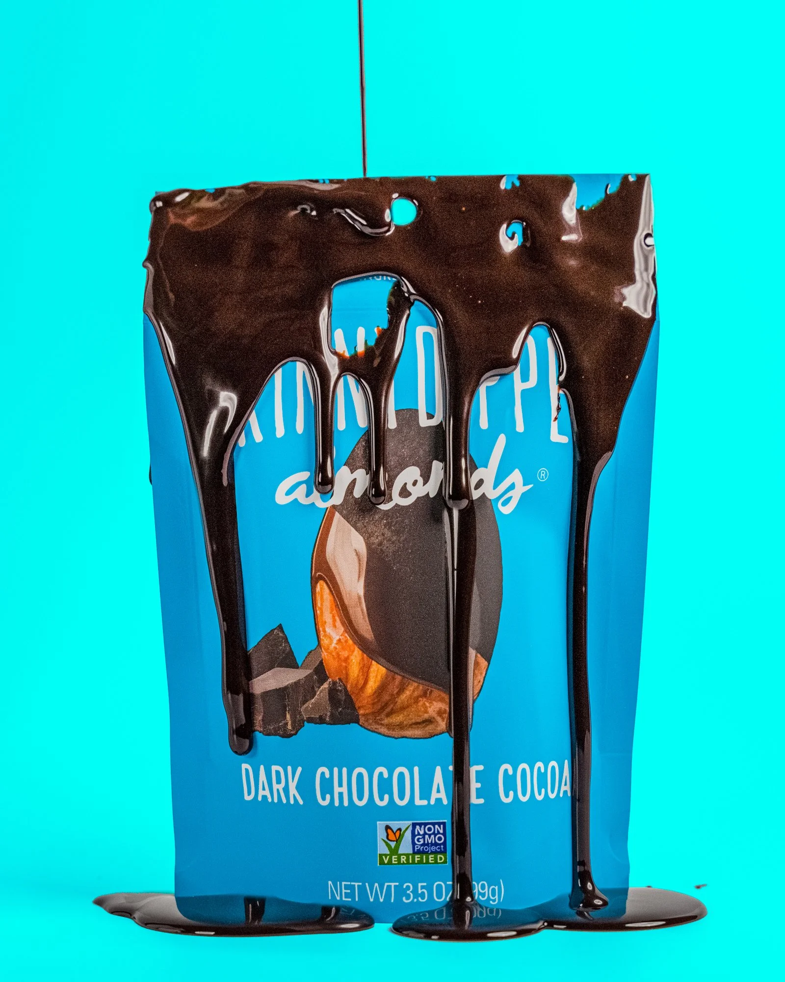 Cocoa Almonds with chocolate dripping from above, set against a bright pink background to match the brand's retro and edgy aesthetic